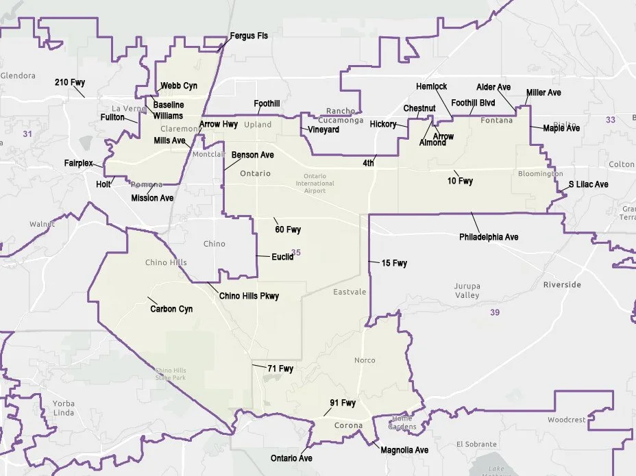 California’s 35th congressional district is based in the Inland Empire and includes, all or in part of, the communities of Pomona, Claremont, Upland, Rancho Cucamonga, Fontana, Bloomington, Ontario, Chino Hills, Eastvale, Norco, Corona.